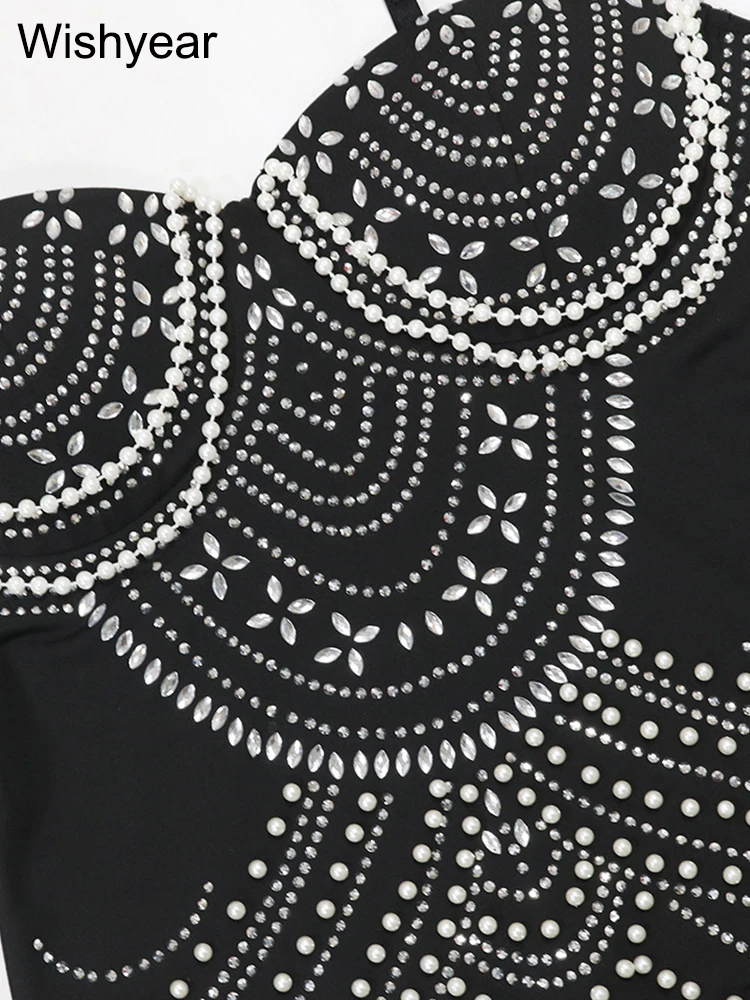 • The V-neck and spaghetti straps create a sophisticated look, complemented by sparkling rhinestones and pearls that catch the light beautifully.