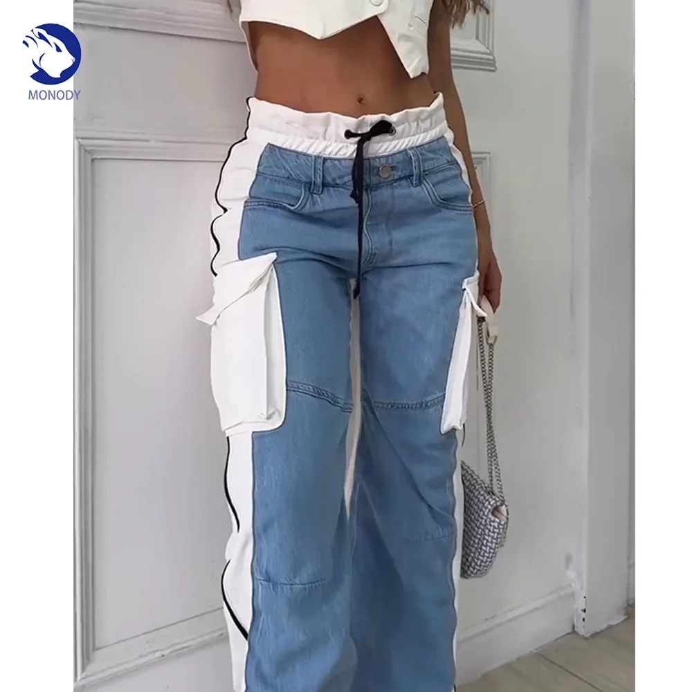 Women’s High-Waisted Baggy Casual Jeans Patchwork Cargo with Lace-Up Streetwear Y2K Loose Straight Trousers